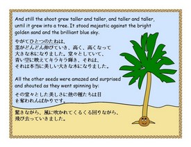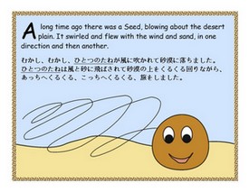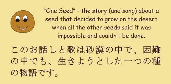 Teacher Marcia Haug, at the New Beginning International Preschool in Japan, has been presenting One Seed as a play for the student's graduation. Parents and teachers created the sets and costumes, and the children took on the roles of seeds, plants, and birds and insects, and trees. The play has been presented in English, which the children are learning as their second language. Meanwhile in 2025 parents asked if the story could be published in their own language, Japanese. And so the One Seed book is now available in that language, and on this page, FREE as a PDF.